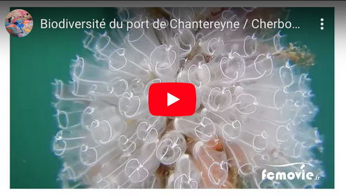 Sous les pontons du port de Chantereyne à Cherbourg, les organismes filtreurs de nombreuses espèces, Ascidies, Spirographes, Clavelines, éponges, ... colonisent le moindre centimètre carrée de surface disponible. Parmi les blocs rocheux les poissons comme les rouquier, la vieille ou encore le tripterygion trouvent abri et nourriture. En surface, mélés aux algues brunes du genre fucus, des juvéniles de lieu forment de petits bancs d'une dizaine d'individus. |
